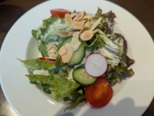 先に運ばれてきたサラダにはスライスアーモンドが効いていて、食欲をそそります。