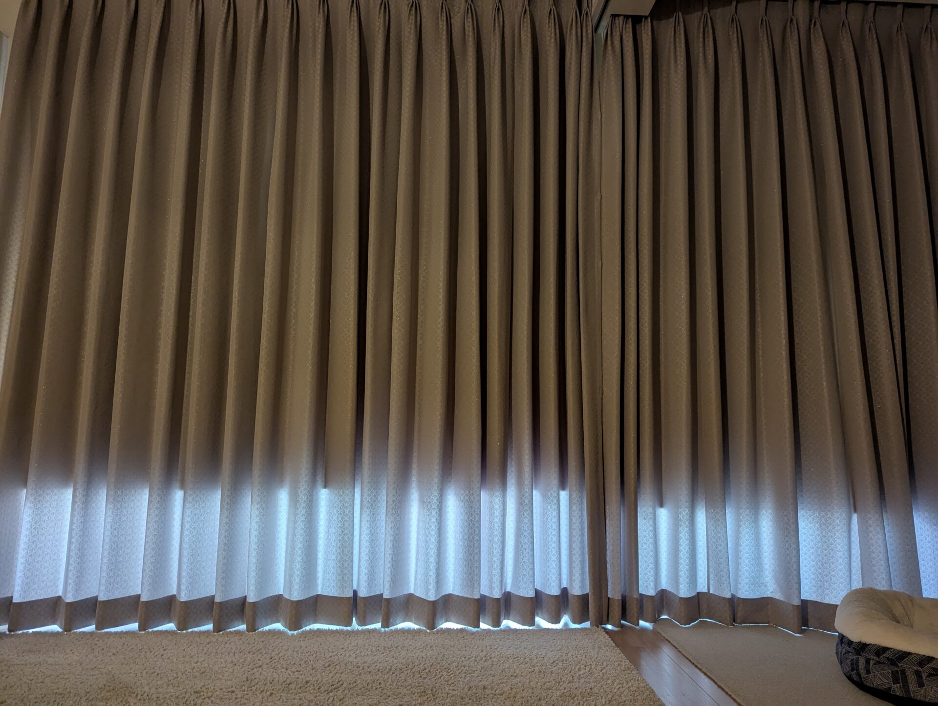 夜にカーテンを閉めると完全に遮光されて真っ暗になります。おかげでSも「朝だよ!」と吠えなくなりました!